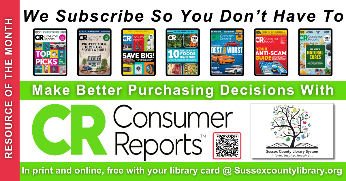 For more information on Consumer Reports and all the resources SCLS has to offer, visit a branch near you or browse the library’s online resources at Sussexcountylibrary.org/databases. Library cards are available to anyone living, working or going to school in Sussex County (except Sparta). Apply in person at any SCLS location or online.
